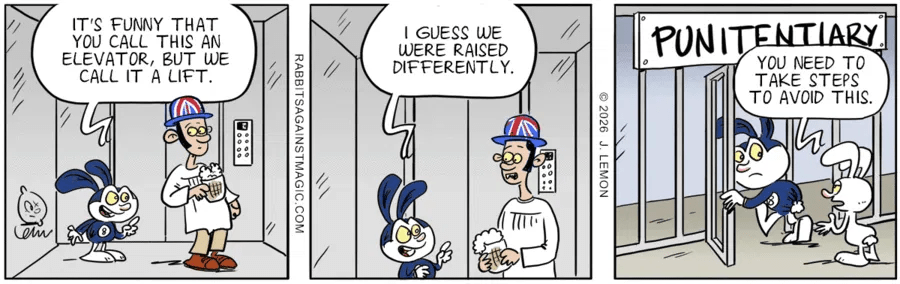 Jack Applin sends this in: “The rabbit, Eightball, seems to have it backward—he states that the British caricature calls this an elevator, but the British generally call that vertically-mobile conveyance a lift. He also states that “we” call it a lift, but I’m not sure where “we” are. I always figured that Rabbits Against Magic took place in the USA (the January 12 states that “we invaded Venezuela”).