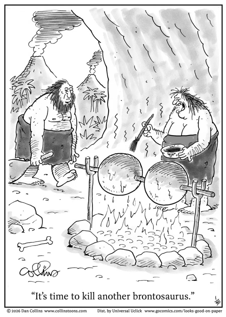 Never mind that Brontosaurus didn’t actually exist (it was a conflation of a couple other species that did exist) I don’t know what the gag is. Or what the things on the rotisserie are.