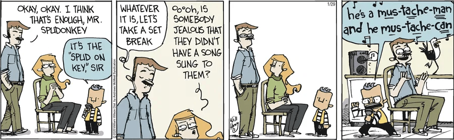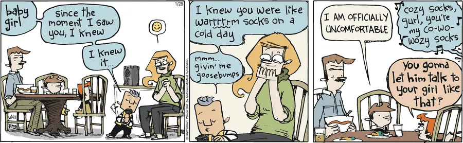 The construction is curious. Is the yellow character (the editor isn’t fully familiar with this strip) supposed to be seeing/hearing some of the word balloons but not others? Is the joke just going over their head?