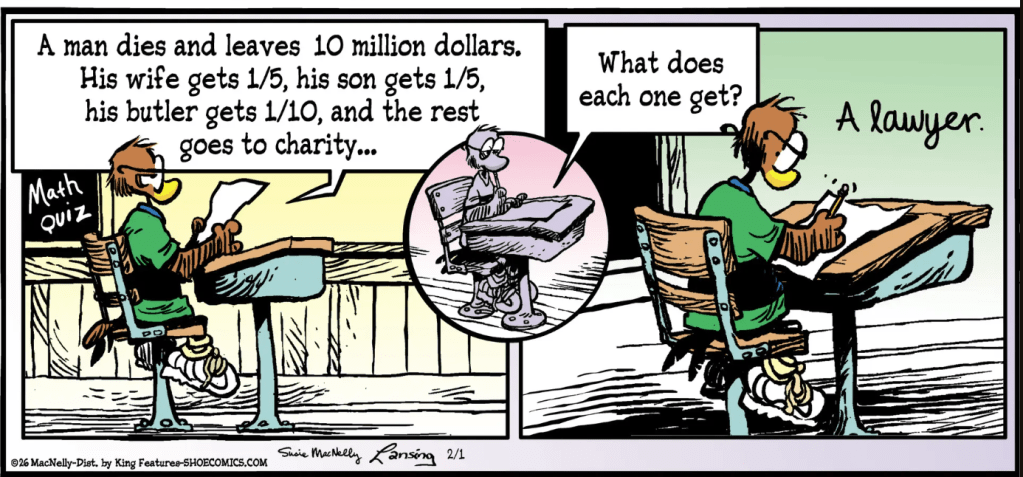 Boise Ed also sent this one in: “The first two panels are good. It’s the third one that puzzles me. My friend Mr. Google tells me Adam Grant is an organizational psychologist and bestselling author who studies how people find motivation and meaning, and Daniel Kahneman was an Israeli-American psychologist best-known for his work on the psychology of judgment and decision-making as well as behavioral economics. I can only guess that the book-report assignment was on a title of the student’s choosing, and Caulfield may have chosen a book by one of those psychologists. Maybe he wrote something frivolous and is counting on Mrs. Olsen liking the origami too much to unfold it.”