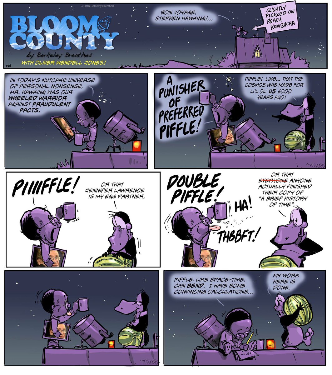And then there is Bloom County’s tribute to Professor Hawking, which I like much better . . .