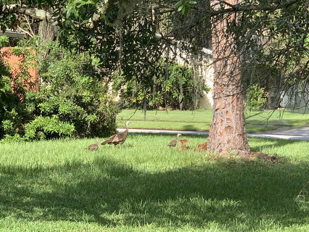 (Yes, we have all sorts of wildlife come visit – we live in a conservancy area, right next to a nature preserve. Makes for interesting times . . . coyotes, a herd of deer living in the high grass next door and eating the flowers in my hanging baskets [I quickly learned what plants are deer-resistant] and attempting to eat an artificial holiday wreath, supposed bobcat sightings, kids destroying the golf course, [supposed] bear & cubs sighting [altho it being Fourth of July, I put that ‘sighting’ down to Jack Daniels], alligators [‘Where there’s water, there’re alligators”], turkeys in trees who’ve obviously NOT watched the WCRP episode and DO fly, as well as limpkins, ibises, cranes, herons and endangered wood storks.)
