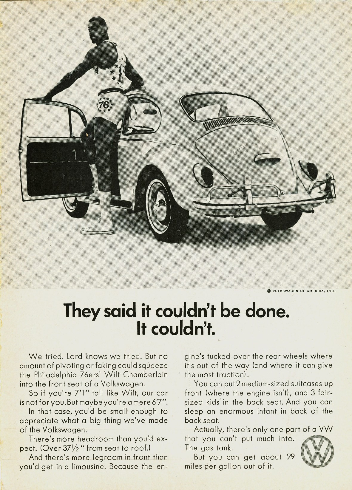 I still remember the ads with Wilt Chamberlain standing next to (actually over) a VW bug claiming he could fit into it. Which he could, because the seats slid all the way back to the back bench seat. Plus the sun roof probably helped.