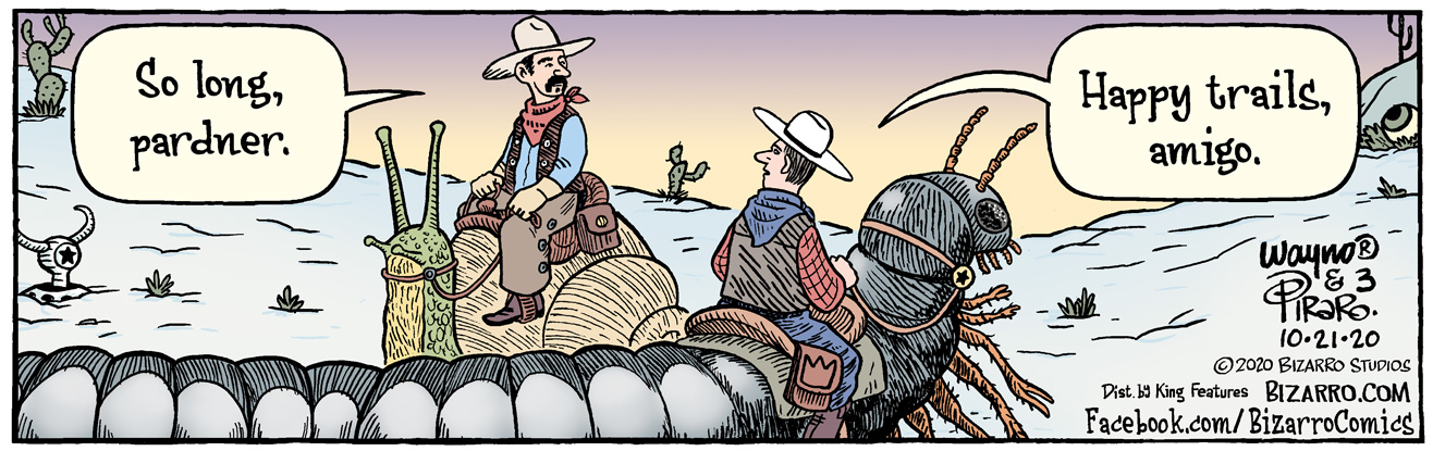 The Bizarro is a pun. One cowboy’s ride leaves a trail and the other is so long.