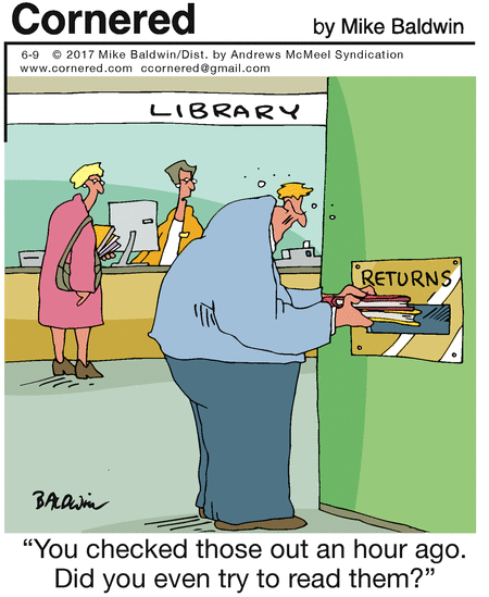 @ WW – I don’t think there’s anything more in this comic than the “Schadenfreude” presentation of the customer’s embarrassment and flop-sweat reaction. Perhaps he checked out a couple of literary tomes in order to appear “quite the intellectual” to the librarian, but she’s seen through the subterfuge, and makes sure that everyone else does, too. Of course, if he really was trying to impress that librarian, it would have helped to have drawn her as an attractive, younger woman. Unfortunately, all of the characters in “Cornered” always look like ageing retirees, even when they are supposed to be children.