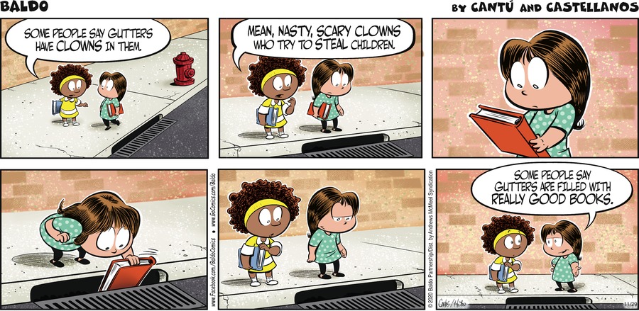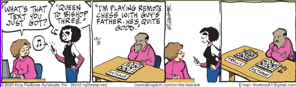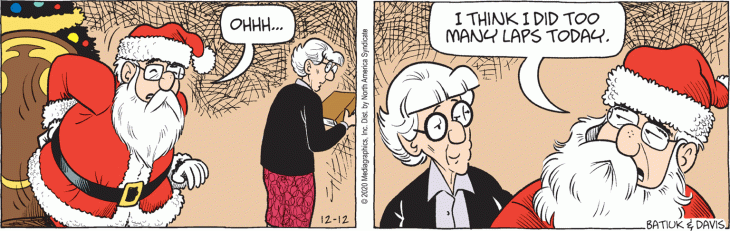 In case you didn’t know, the “Nick and Zuzu” comic panels run as accompaniment to an advice column by Carolyn Hax. Sometimes they really depend on the writing and are totally CIDU without it. Other times, the comic is quite independent of the column which sparked it; and that is the case here. And the cartoons appear elsewhere, where the column is not available or even mentioned, such as GoComics.