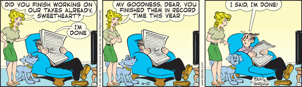 We think there’s a modern use of “I’m done [with that]”, probably more common among people considerably younger than Dag, amounting to “I’m never going to be involved with that at all, ever again”. Do you know that sense? Is Dagwood meaning it that way – in both places? Since Blondie is taking it the standard way, is anybody doing the Bumsteads’ taxes this year?
