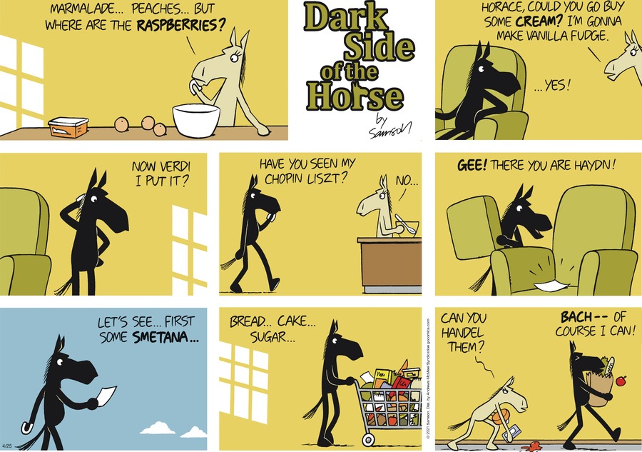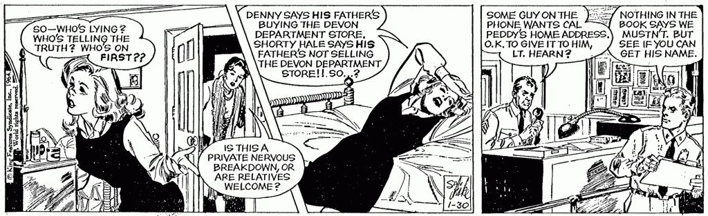 And incidentally, even for an established ditz like Eve, isn’t the invocation of “Who’s on first?” in panel 1 a bit of an unsupported swerve? (For those not familiar with the strip, Eve is the blonde younger sister, and the titular Juliet is the brunette older sister looking in from the doorway.)