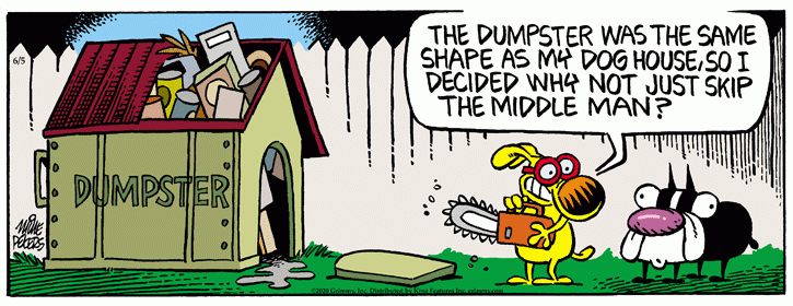 So I submitted this, and today when it showed up, I actually saw the dumpsters outside our building, and they are like the ones pictured up-thread, and I instantly got how this joke came about — these dumpsters, seen from the right angle, kind of look like dog houses, just lacking the door — so, add a door, I can hear the cartoonist thinking, and instant doghouse! har, har, hyuck, ahh…! That’s all there is, it was all so clear to me: why a dog? Because it looks like a dog house. Why a dumpster? Because it’s a dumpster that looks like a dog house. Why is he bothering to cut the door in the dumpster and not just live in the dumpster if that’s what he wants? Because that’s reversing causation and explanation, see, it looks like a dog house, this dumpster, it’s just missing a door, see, so all the dog needs to do is add a door to get instant snoopy doghouse, see? and just add some lines about how he’s always wanted to live in a dumpster, my work here is done!