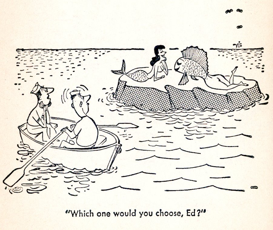 “What do the offspring of a man and a mermaid look like? Human from the knees up and fish from the knees down?”It’d be more original if the bottom half of the mermaid tail were human and the top half fish.