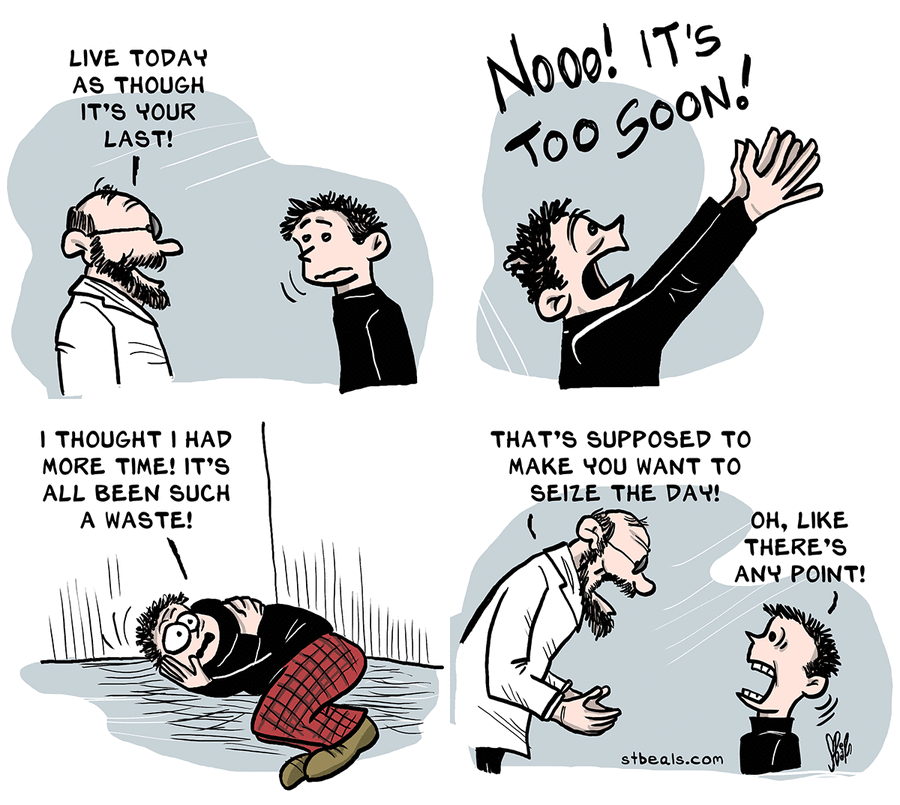The next to last cartoon reminds me of a conversation I had with my store manager. He said we should work like there is no tomorrow. I told him if that if there is no tomorrow why am I here? I am going fishing.