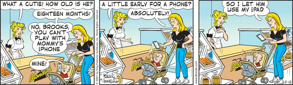 But anyhow, this little story has the structure of a Turnabout or maybe Topper trope. (Thorne Smith allusions entirely accidental!) Blondie looks shocked in the last panel, as though the mom’s substitution of the iPad as the plaything is even more of a shocking violation than the phone was. But is that so? Or is the mom’s “reasoning” sort of correct, and there is a greater likelihood of the child being able to make some use of a tablet than of a smartphone?