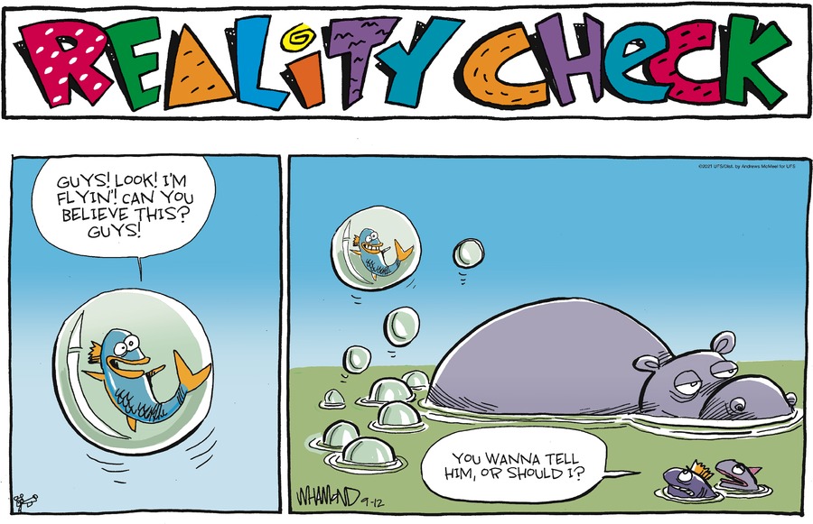 Here’s a Reality Check from Stan, who says ” A couple of things didn’t quite scan with this for me. If that bubble is what I assume it is, I don’t think he’d need to be ‘told’. Also, why are the fish wearing regal headgear?”