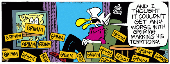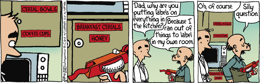 When I was a kid in the early 60s, those label makers were so cool they were used as prizes on local kid shows. Perhaps the joke is a geezer still thinks they’re cool. Not really the same joke as Grimm marking his territory in visible form.