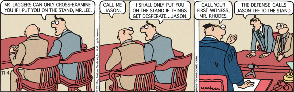 Is the ‘joke’ in the second one that the defence lawyer hasn’t really explained to his client how desperate his situation actually is? It’s so bad, in fact, that he’s calling him up as his first witness. The first two panels are just there to clarify the client’s name so the reader is sure that it’s him, and no other Mr. Lee, that is being called up.