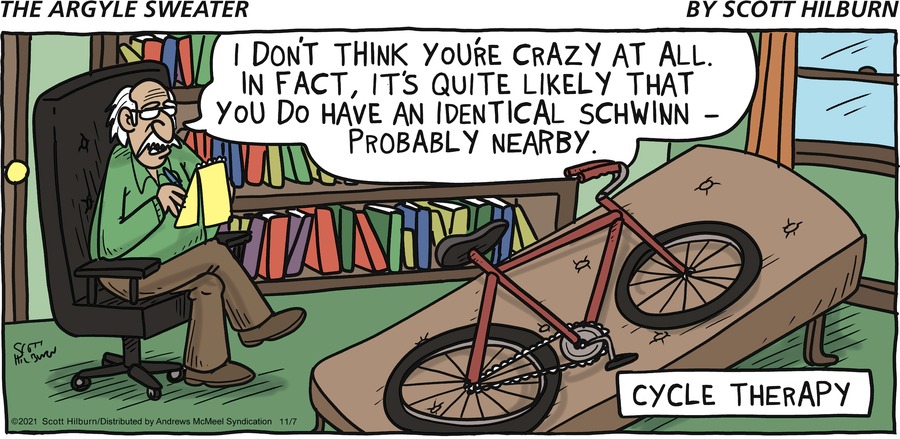 In some of Anthony Burgess’s novels he has characters (or narrator voice) using the phrase “trick cyclist” to replace “psychiatrist” — as in “Watch out, they’re going to send you to the trick cyclist!” Later I saw it elsewhere, and at first thought it an homage to Burgess, but also saw indications that it was an established bit of British slang.