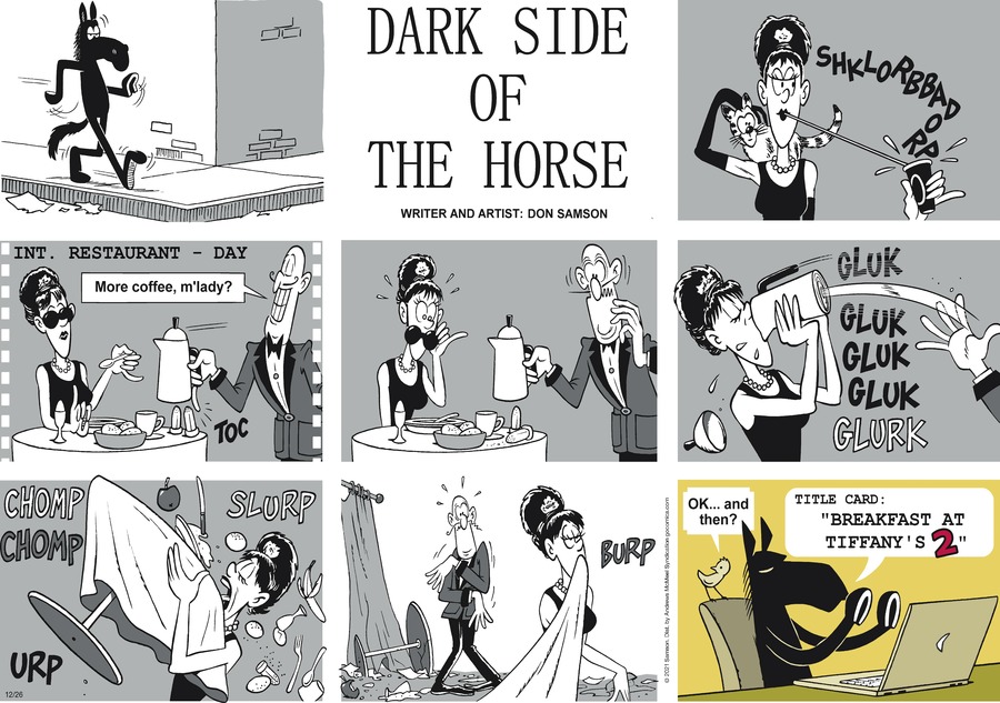 From guero, who says “Okay, today’s Dark Side of the Horse is a great homage to Don Martin, but what exactly is the joke? (I mean in the punch line – the cartoon perfectly captures his style and humor.)”