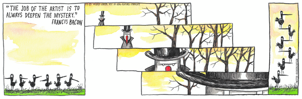It’s just a mood piece. It’s not trying to say anything specific, it’s just evoking an emotional response. In this case, the birds are standing around, the MMIB approaches (in dramatic Sergio Leone widescreen) and they feel compelled by his gaze to stand on each other’s beaks. It’s supposed to evoke an image of dark power and dread, and honestly it does that pretty well. The sickly yellow sky helps to make the scene kind of despairing. I do the same sort of thing frequently in my own work.
