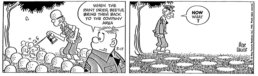 This Beetle Bailey is from 1965-05-17, and appeared in ComicsKingdom retro series recently on Thursday 2021-12-02. I wasn’t aware that spray-painting would be part of helmet maintenance, but I guess why not? But what exactly is going on in the aftermath scene that is puzzling the General? Has the grass in general been painted an odd color, but not inside the helmet outlines where it was shielded? But those patches don’t look like they’re supposed to be natural grass. Or has the procedure somehow damaged / killed off the grass inside the helmets, and left it normal outside?