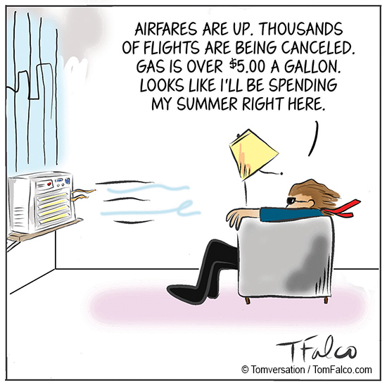 Thanks to Rob S. for this one by Tom Falco. That “Summer at Home” title is the cartoonist’s title for it, and goes with his inflation-leads-to-staycation topical message.