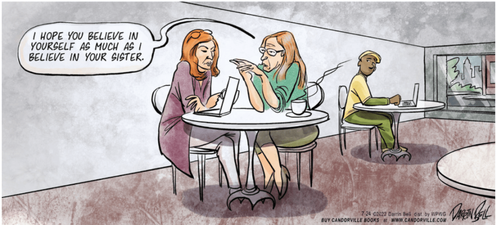 I did figure this one out, but it took me a while. The problem for me is that the faces of the two at the table sent me in a different direction. The dialogue balloon being placed next to the person who isn’t speaking didn’t help.