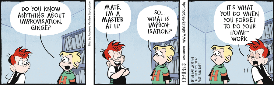 Ah, Ooten Aboot beat me to it. The side comment never is connected to the actual strip. Every now and then, it’s actually funnier than the strip. BTW, Saturday the 10th will be the last new Ginger Meggs daily strip, because Rupert Murdoch, he of “Fox News”infamy, killed off the entire Australian daily comic strip industry. (See https://www.dailycartoonist.com/index.php/2022/08/27/comic-strips-going-down-down-under/)