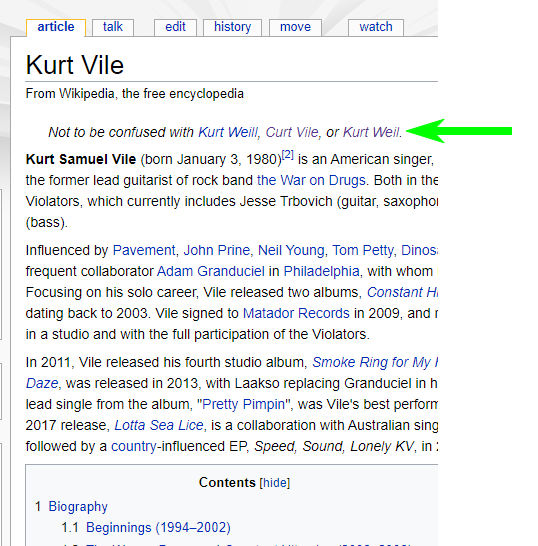 BTW, Wikipedia says for this one: “Vile grew up in Lansdowne, Pennsylvania, a suburb of Philadelphia, and is the third oldest of ten children born to Charles and Donna Vile. Although his surname is occasionally assumed to be a pseudonym and a pun on German composer Kurt Weill, it is his real birth name and the similarity to Weill’s name is a coincidence.”