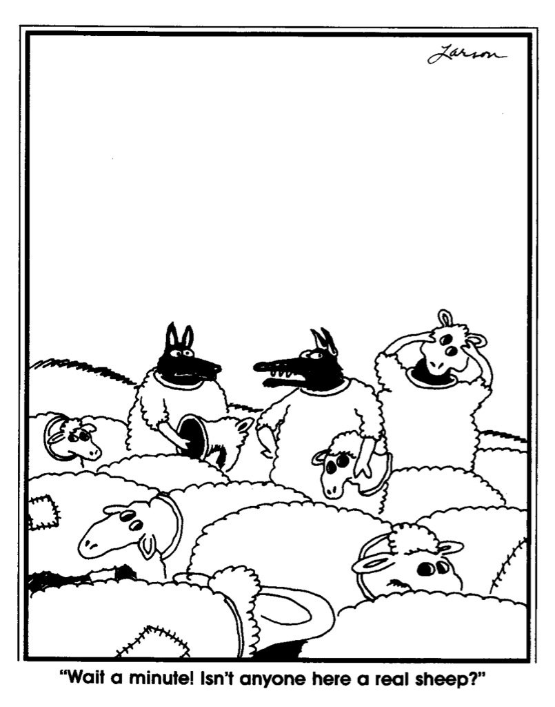 At first I thought it was like the old Far Side comic (see below) where all the wolves show up disguised as sheep. I actually misremembered that, as I thought there was one real sheep in the flock, wide-eyed.