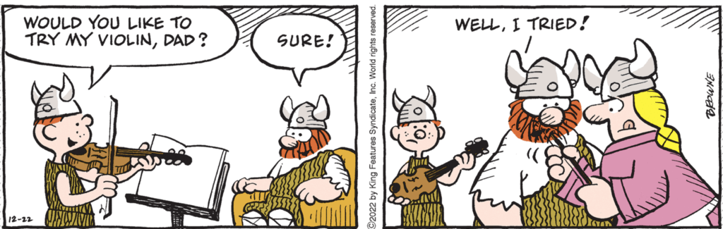 Dirk the Daring sends in this one. The basic joke is just that Hagar messes up. But the details? Did he try to eat it? Did he impale himself on it? Did it get stuck in his beard? (but an internet search on “images violinists with beards” returns a lot of violinists with far longer beards). What’s the situation in that last panel?