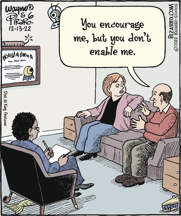 I’m hoping someone comes up either other options for what it could mean. If it is one of the two offered it isn’t really a joke and more a commentary on the distinction between encourage and enable.