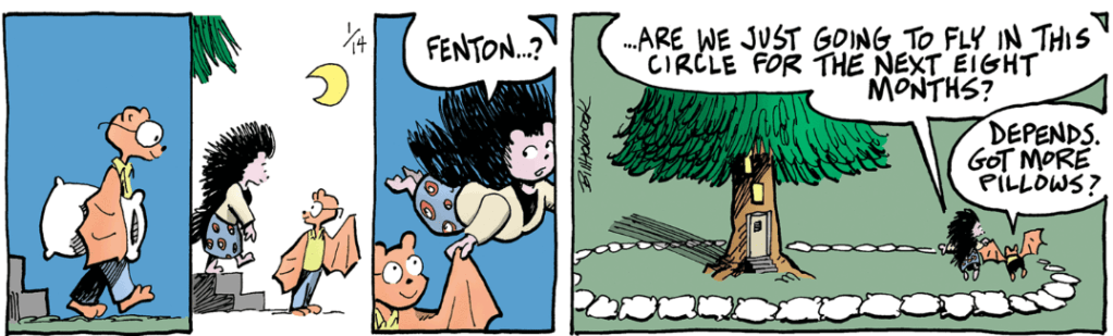 Dirk the Daring notes “Even though I follow this strip, I can’t figure this one out. She’s preggers, he hold her up while he flies, but all those pillows? Some kind of protection? I don’t get it.”