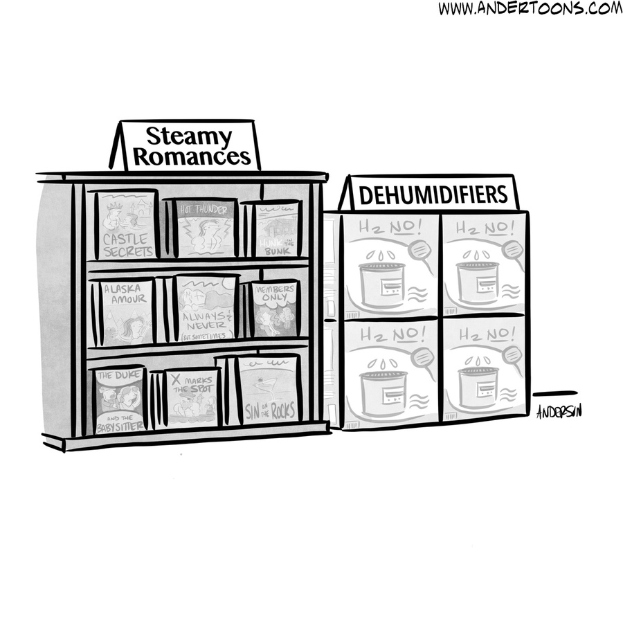 The artwork makes the steamy romances as well as the dehumidifiers look fogged, like a steamed bathroom mirror.