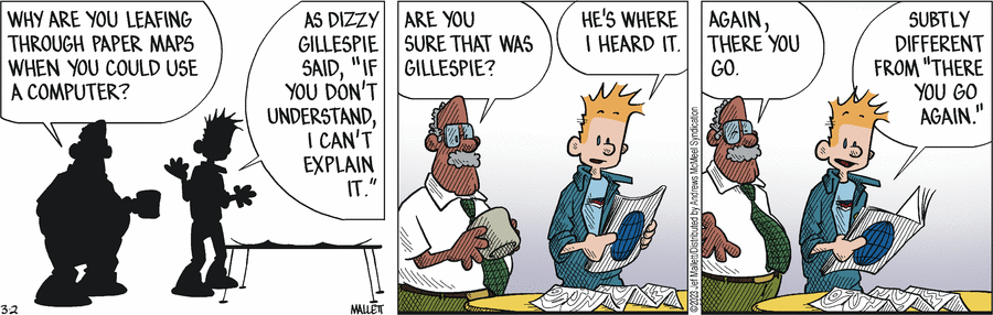 I’m too lazy (or rather, disinterested) to look up whether Dizzy Gillespie ever really said anything like what Frazz quoted, but I am very glad that I took the trouble to leaf back to the start of the series (on Monday 27-Feb-2023), because I was about to suggest a “better” quote, only to discover that it was already used on the very next day:
