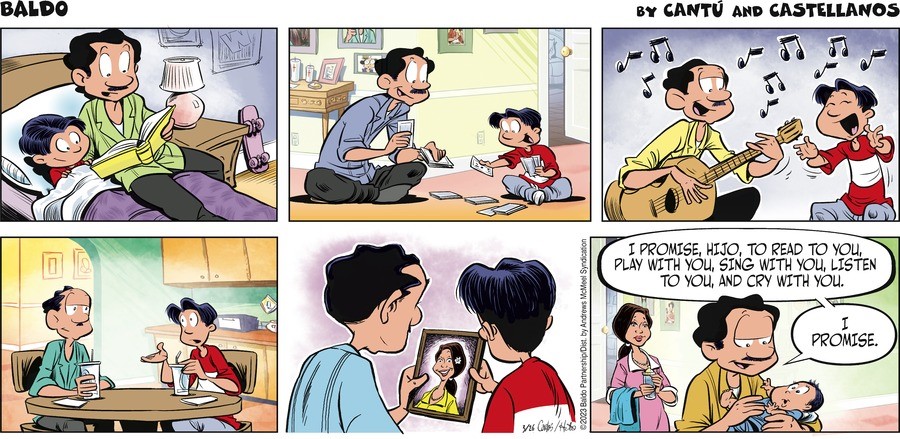 It is just a sweet strip, no real joke and nothing more. Baldo’s mother died and this is just showing that his dad has kept his promise.