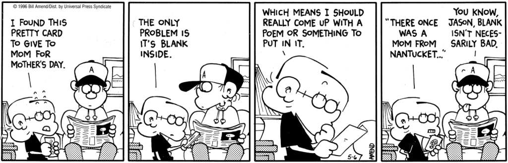 There is a motherlode of Mothers Day cartoons from Foxtrot collected at their website, of which we will sample just a couple.