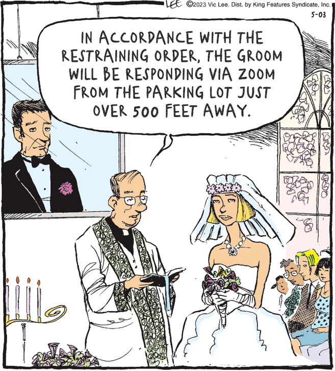 Thanks to Boise Ed for sending this one! “Pardon My Planet often has head-scratchers, but this one really befuddles me. If she has gotten a restraining order to keep him 500 feet away from her, why is she about to marry him?”