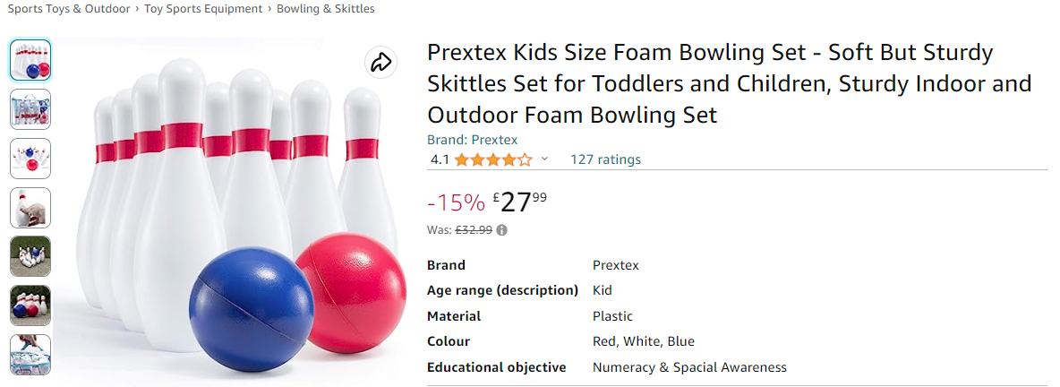 @ Narmitaj – It took a while to figure out which kind of “Skittles” you meant. Kindle refused to display the preview†, so I first thought of the candy, but opening the frame in a new window revealed the Amazon-ID for a kids’ bowling set, which means you were talking about this kind of “skittles“, which fits much better with your “dodgy” premise.