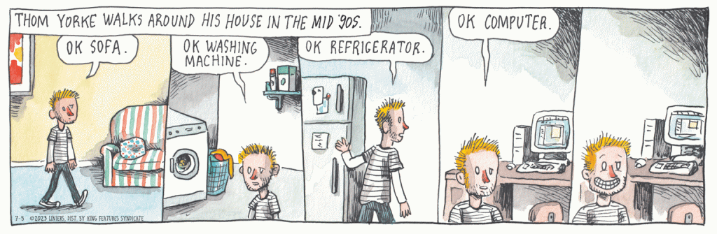 P.P.P.S. @ Mitch (3) – I agree, the reference is just too obscure. The album was released 26 years ago (in 1997), and I had never heard of it (nor of Thom Yorke) before I saw this comic.