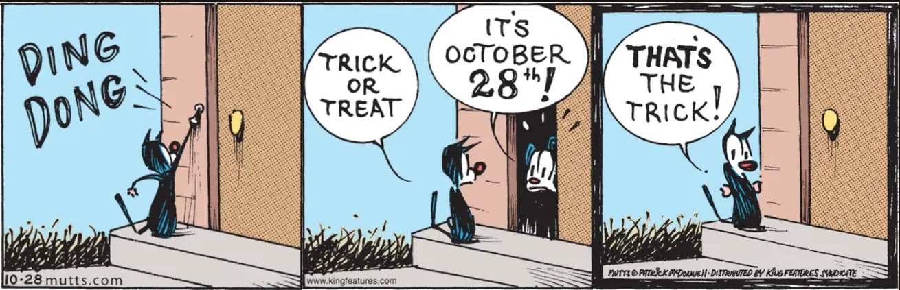 Hallowe’en anticipation from Mutts. This did appear on Comics Kingdom today, 10/28, just as it says internally.