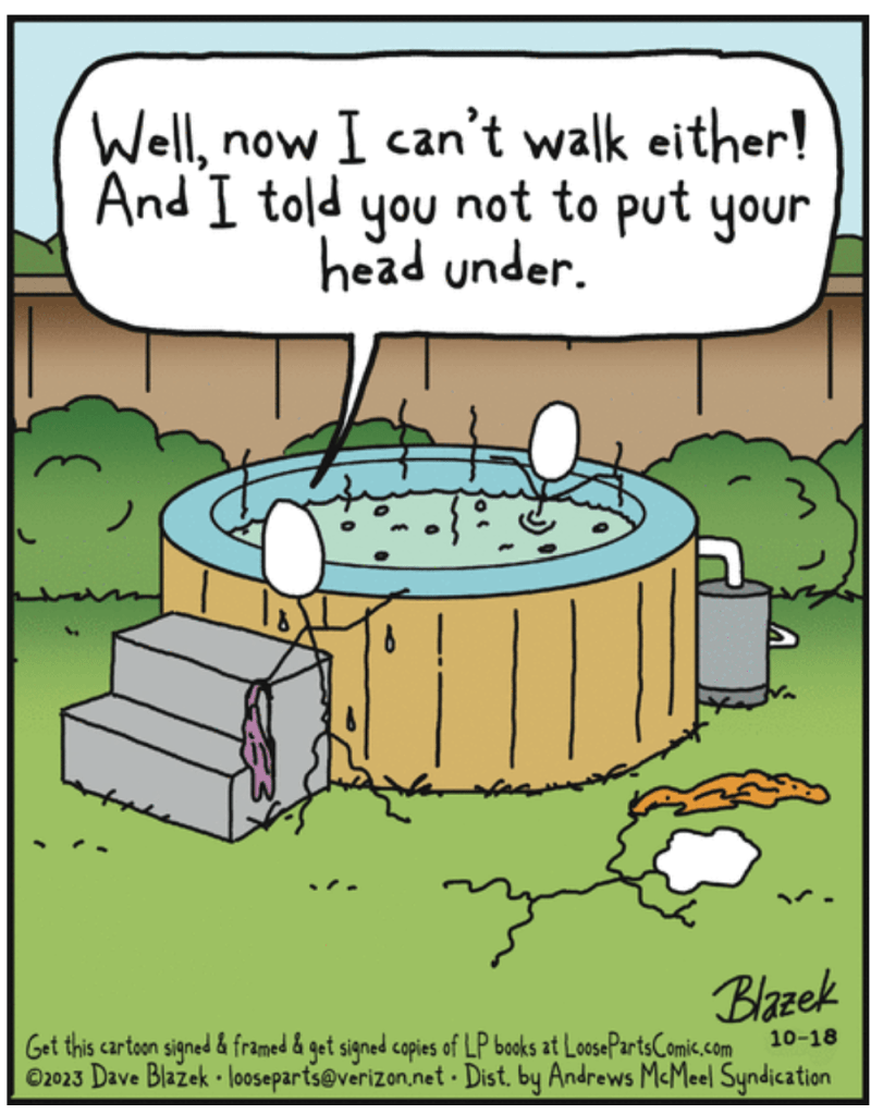 Is this some homage to XKCD? Or to some other cultural reference? Why would stick figures be affected by a hot tub? What’s the problem with putting their heads in? Are those towels?