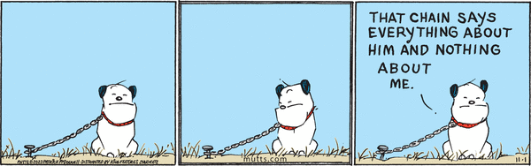 The Mutts strip shown here is one of (very) many in which McDonnell protests against the abusive habit of keeping dogs chained up, but it is notable for the excellent pun in the final panel. One minor detail that I find puzzling is the expression on Guard Dog’s face: I think that he should be smiling, or perhaps wincing.