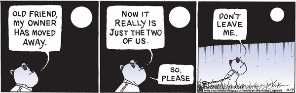 Mutts has just started what seems to be a story about the guard dog’s owner moving away and leaving him behind. We only see the dog frantically barking after the unseen owner and moving truck.