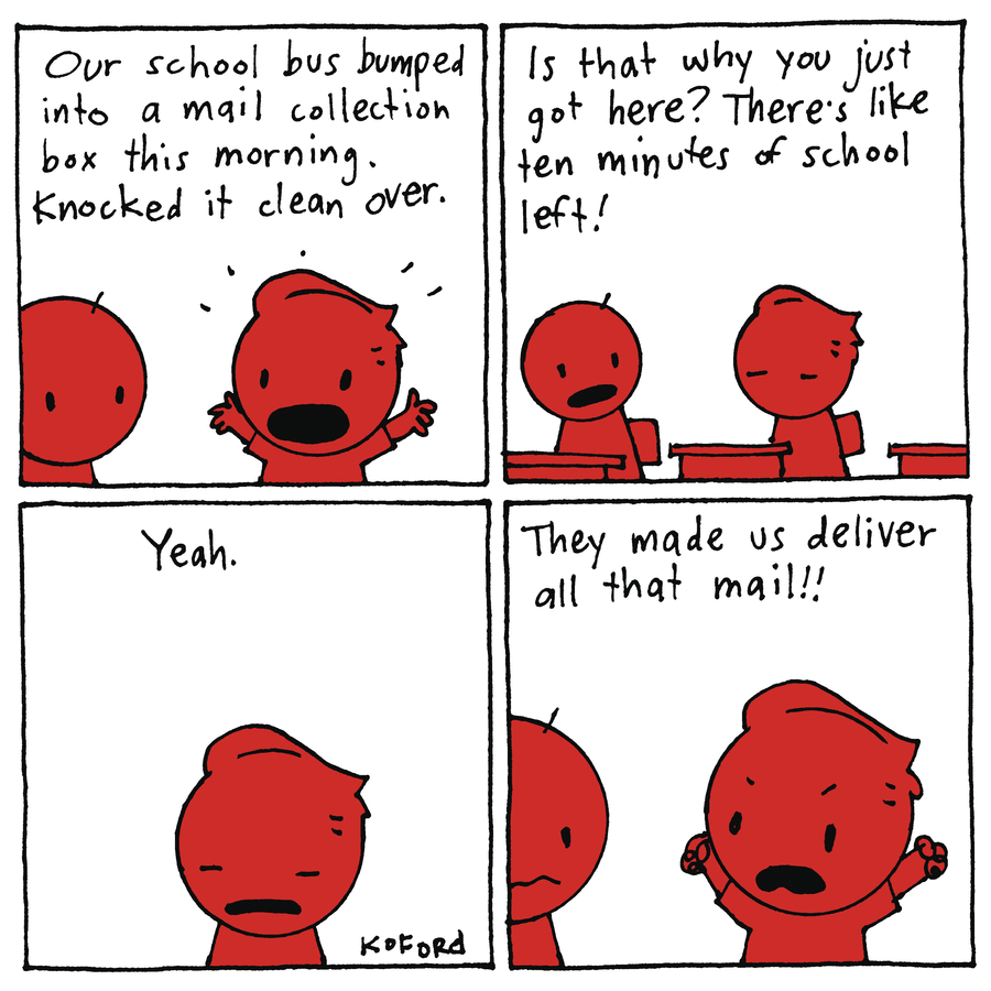 The joke could perhaps be saved by making it a [postal] relay box. These are the somewhat larger boxes, in a khaki-green, with no public deposit latch, only a side door with a lock. When a local delivery carrier with a bike or pushcart sets out from the station to begin their route for the day, it would be awkward to have to carry all the mail for the whole route. So it gets broken into two or three stages, and a truck from the station goes around to the relay boxes in the area and drops off the packets for the later stages of the routes being serviced by bike or hand-cart carriers. If the bus in our cartoon had knocked over one of these, the buskids could plausibly have delivered them. (You don’t need to know the route — just “follow the mail”.)
