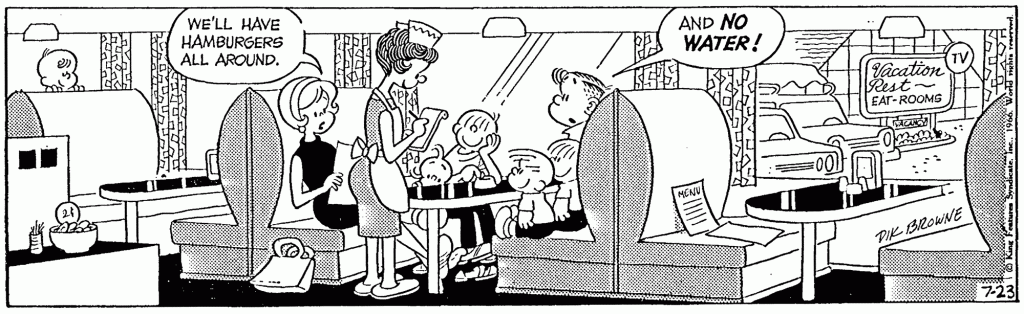 Uh, why? Are the Flagston kids prone to troublemaking by squirting water at each other thru straws? Or does Hi have the belief that the rate of urine production depends on amounts of liquid drunk, and he doesn’t want to have to stop again too soon? Or is there some folk theory under which hamburgers and water just don’t mix well?