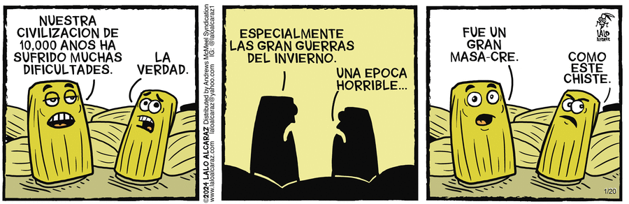 But the crux of the puzzlement is in the final panel. We have the material for a pun, in partial split meanings: masa by itself can mean dough, and masacre written solid would be the obvious massacre, or as Google Translate for some reason prefers, slaughter. But we have to ask, if there are fluent or native Spanish speakers here, does this work for you as a joke?