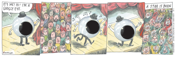 The author wasn’t making any unusual wordplay with “a star is born“, but I mistakenly identified a joke that was not there. The German term for “cataract” is “grauer Star“, and I forgot that it’s not called that in English, and was expecting the “googly eye” to go blind in the next day’s strip. Ooops again.
