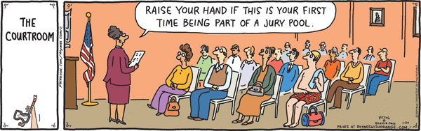 At first glance I thought the woman was trying to trick innocent candidates into volunteering (only first-timers would be so silly as to actually raise a hand; anyone with jury experience would know that maintaining a low profile is the best strategy to escape selection). Then I re-examined the artwork and realized that the gag was just a simple pun. Ooops.