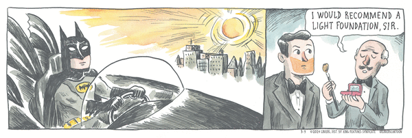 Coincidentally, Saturday’s “Macanudo” had an alternative take on Batman’s headgear problems: