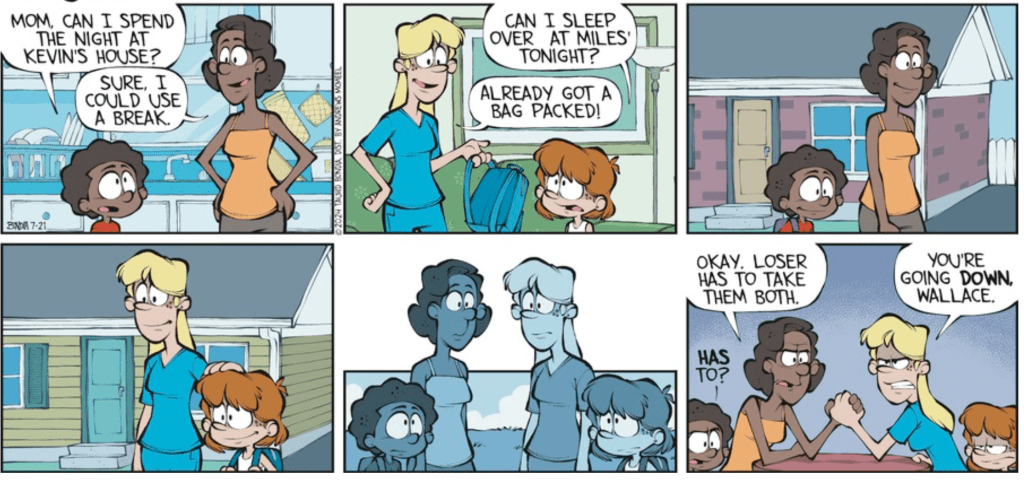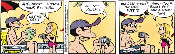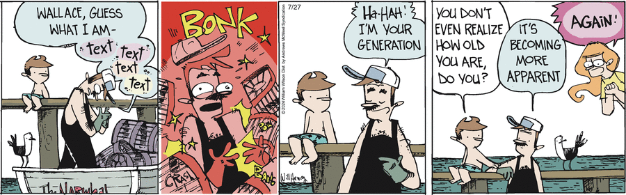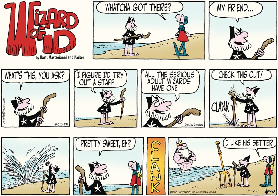 I think the joke in the final panel is clear, but I don’t understand the gag in the second “throwaway” panel, unless it’s a topical reference to some scene in a movie. The part I liked best was the snide adjective in the fifth panel: “adult” appears to be referring to the juvenile wizards in Rowling’s “Harry Potter” books, who all use dinky little wands instead of “manly” staves. On the other hand, the Wizard’s traditional implement has always been one of those wands, as we saw in the “I’m stumped” post just last month: