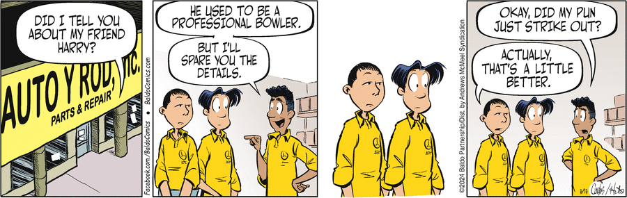In panel 2, the pun in English doesn’t necessarily rely on the stack of tires, as Auto Y Rod is a car repair shop, but I guess it helps illustrate it.